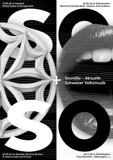 SoundSo ist die Musik-Reihe von Kleintheater und Neubad mit dem Fokus auf Schweizer Volkmusik. Unter der Kuration von Simone Felber, Evelyn Brunner und Kristina Brunner entstehen Begegnungen von Musiker*innen, die sonst nicht aufeinandertreffen. Diese Episode bestreiten Pirmin Huber und das Garagechörli.
